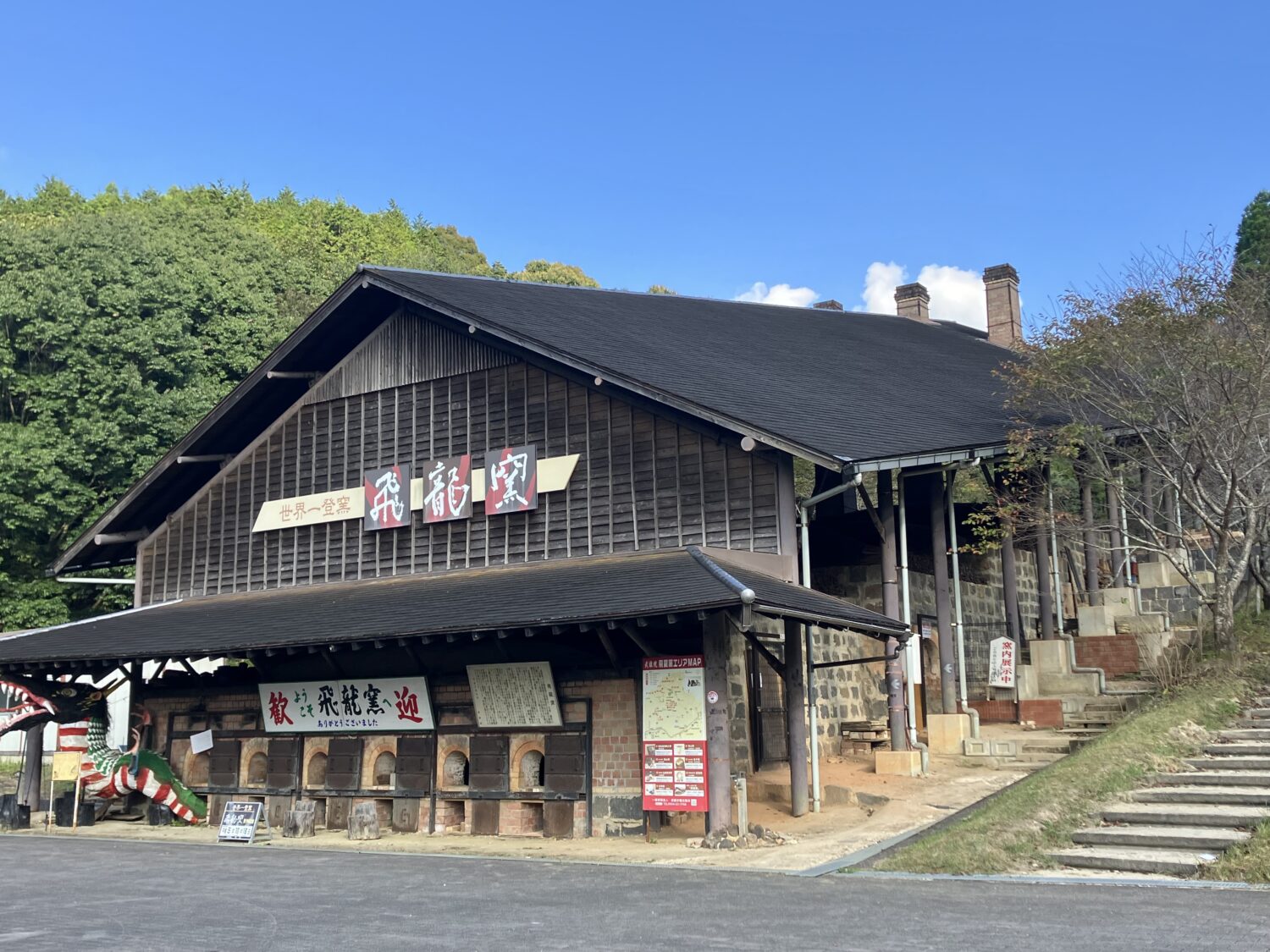 武雄の奥深い山間部に位置している全長23mで、一度に約12万個の湯飲みが焼ける巨大な登り窯です。