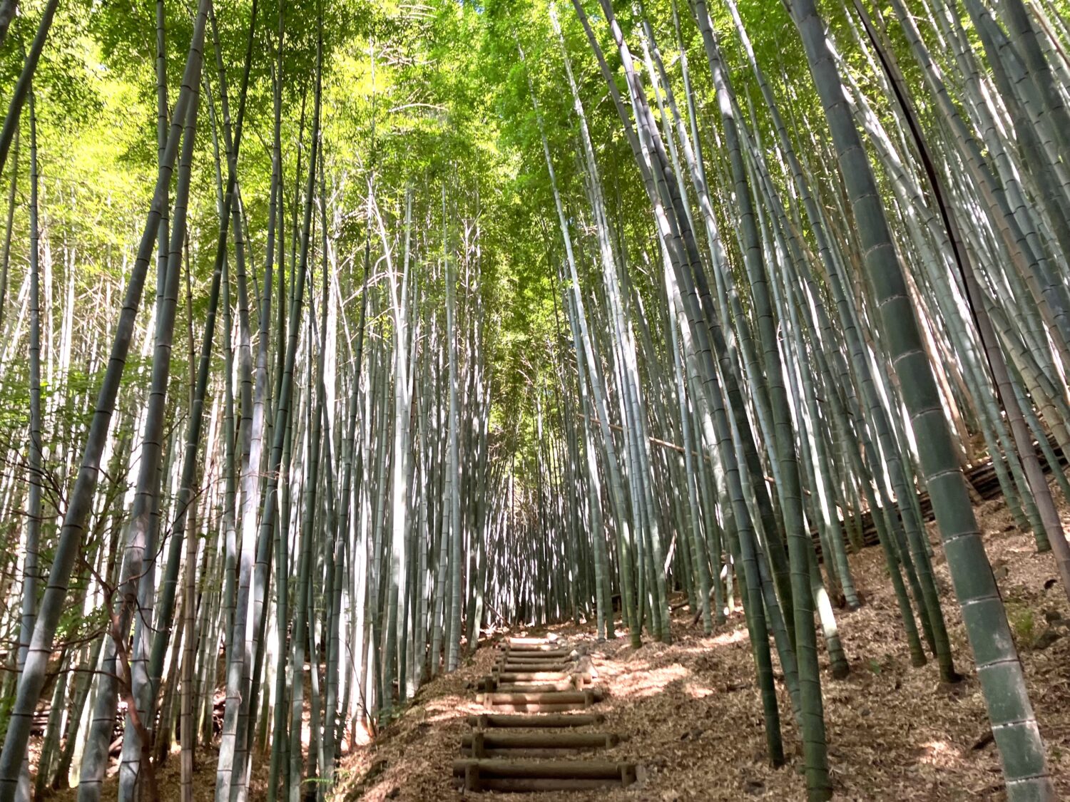 天高くそびえる竹林の間から差し込む陽の光は、感動的な美しさです。